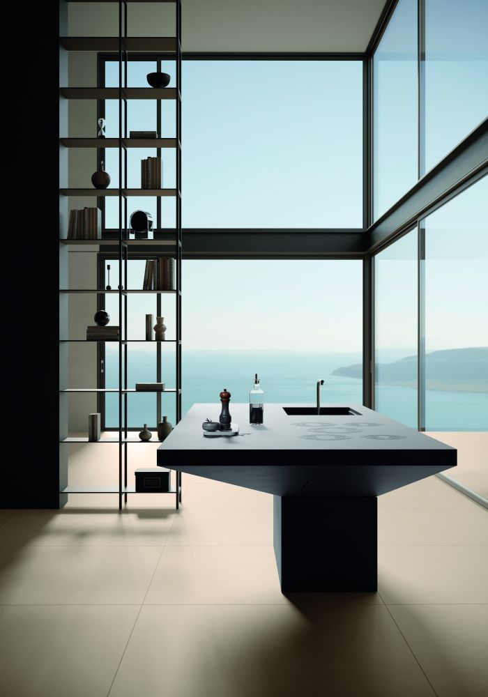 Ballasts in neutral tones with small fossilized and eternalized aggregates in a linear rhythm on the surface of the porcelain express the elegance of the material.