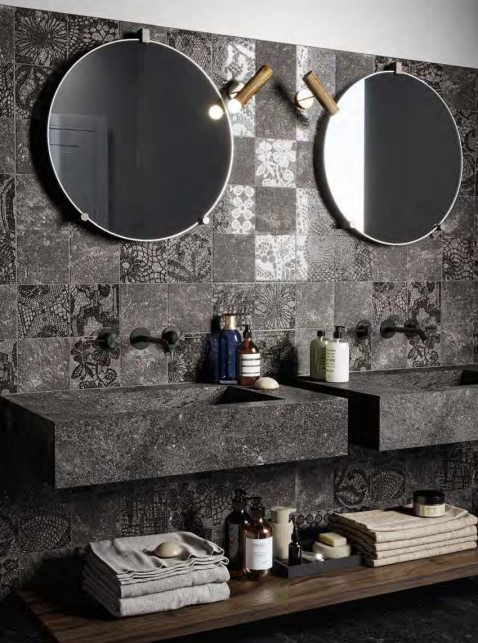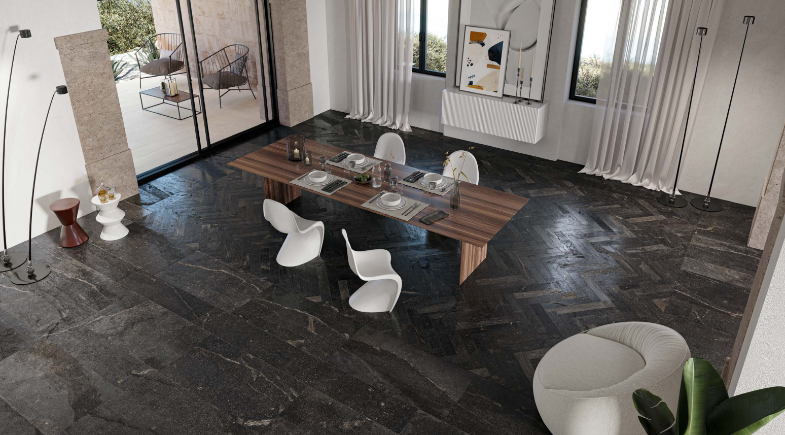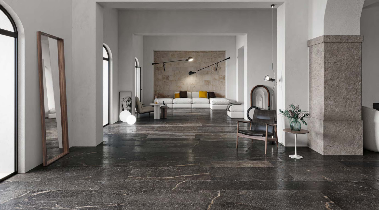 Asphalt rock is a soft limestone impregnated with variable percentages of natural fossil hydrocarbons (bitumen). “Pietra Pece”, distinctive to the city of Ragusa, is a special Italian form of asphalt rock known for its unique colouring ranging from pale grey to dark brown and black; its fossils, veining and strong stippling give its surface character and depth of colour. Thanks to its workability, for many centuries it was central to the art and culture of the ancient part of Ragusa, known in past centuries as “Ibla” because its people, of Greek origin, venerated a goddess of that name. This slice of Mediterranean history, with its people and the special material they used to build their city over the centuries, now gives its name to a porcelain stoneware collection: Ibla.